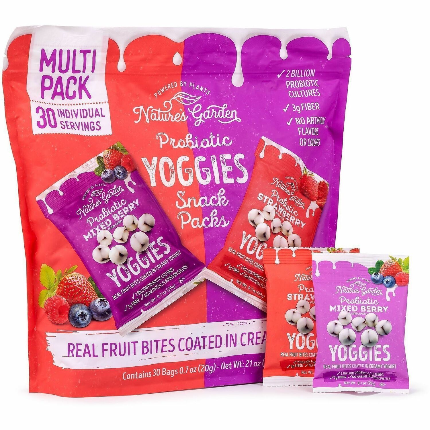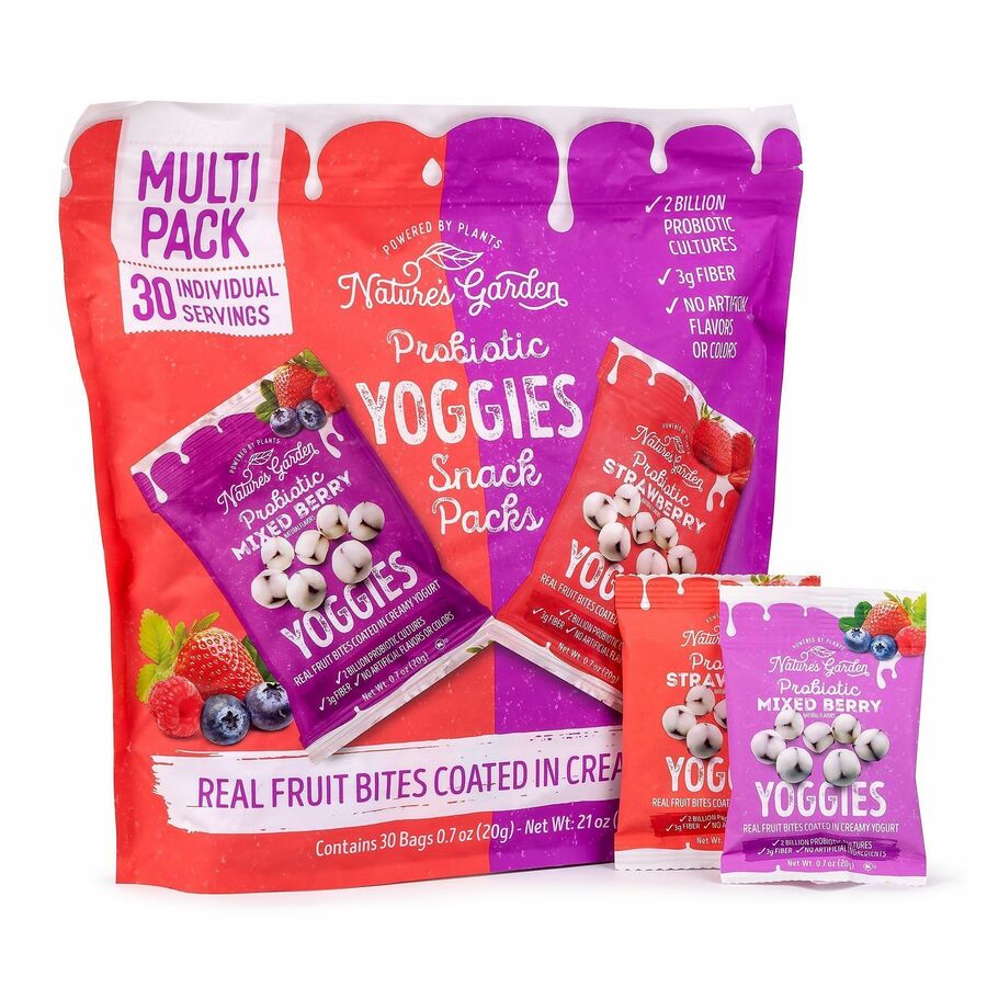 Nature's Garden Probiotic Yoggies Snack Packs deliver real fruit and creamy, natural yogurt in bite-sized snacks. Delicious and functional, yogurt bites provide billions of probiotics in each serving. Chow down on this tasty snack alternative that's creamy, chewy and crazy delicious.